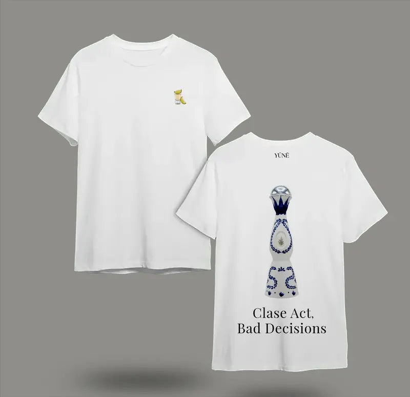 The "Classe Act Bad Decision " t-shirt is made from lightweight, breathable polycotton with a relaxed, loose fit. Designed to stand out and feel effortless - whether you dress it up or down. Soft, airy, and easy to wear, it moves with you and keeps you comfortable all day. Featuring a Clase Azul Tequila Bottle graphic on the back, it's for those who know good taste.